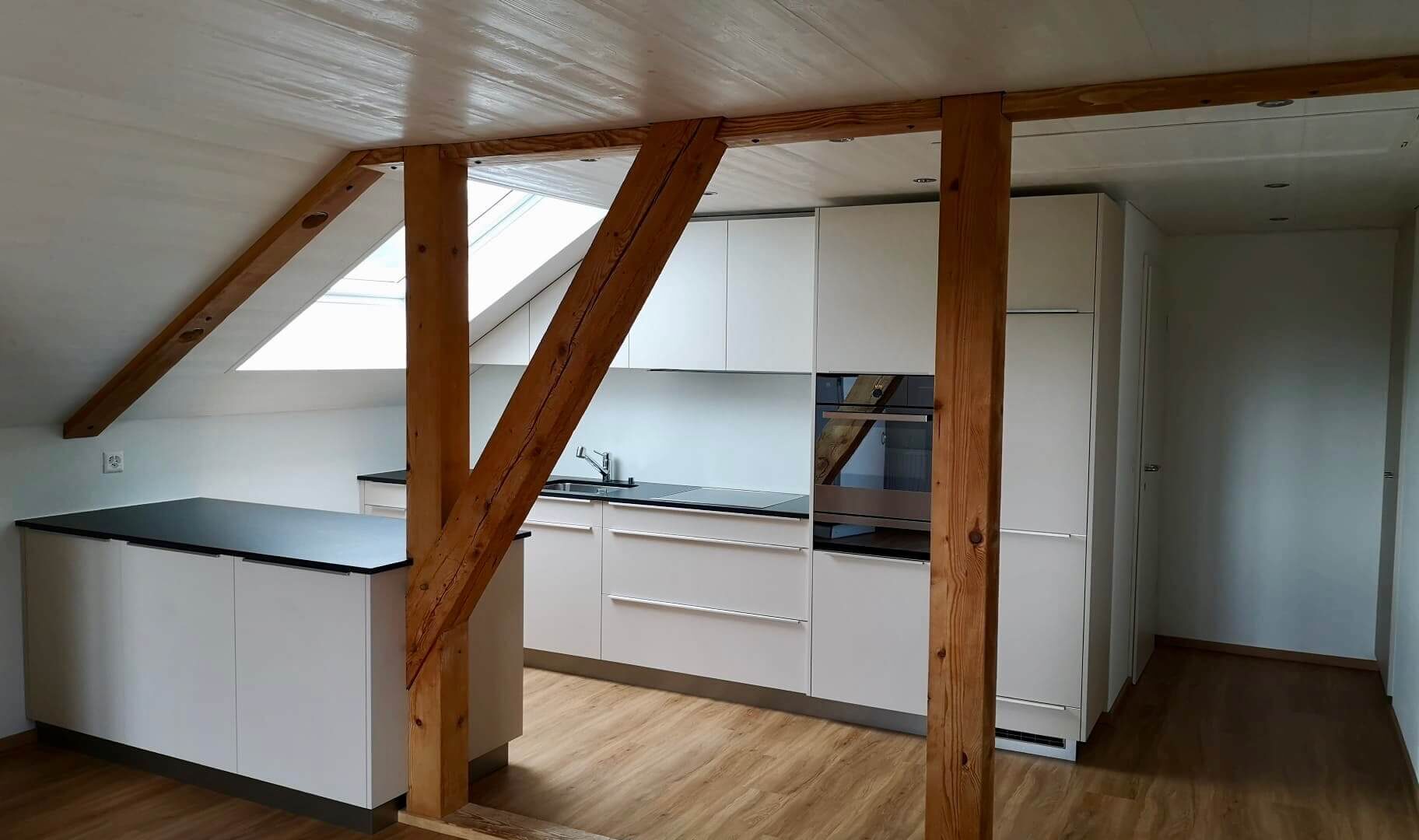 Der Umbau der Küche erfolgte im ersten Stock eines bewohnten Bauernhauses in Alterswil (FR). Die bestehende Holzkonstruktion wurde mit der Vergrösserung der Küche integriert und leicht aufgefrischt. Der Bodenbelag wurde erneuert und die Decke frisch gestrichen.